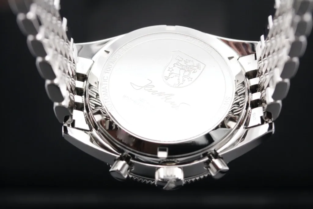 È degno di nota come le anse presentino una somiglianza con quelle degli Omega Speedmaster. L’esterno completo della cassa, incluso il bordo a moneta della lunetta in acciaio e il bracciale, è brillantemente lucidato, sebbene nel tempo saranno inevitabilmente visibili graffi.