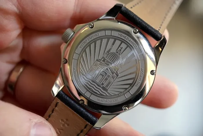 Terminiamo lo studio della cassa, osservando un fondello pieno, leggermente rialzato a “cupola” serrato con 6 viti con l’immagine della Basilica del Redentore, in rilievo; scelta interessante che consente comunque all’orologio di garantire una resistenza subacquea fino a 100 metri.