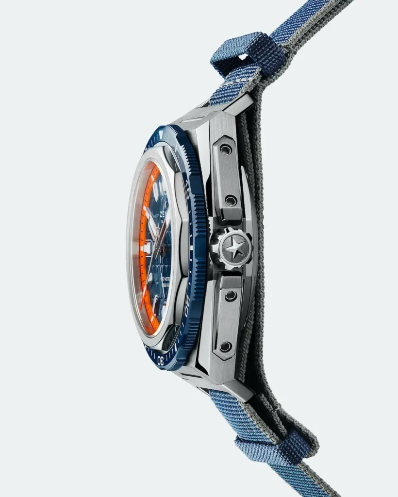 Distintivo per un orologio in questa fascia di prezzo, Zenith arricchisce l’offerta includendo tre tipologie di cinturino intercambiabili senza l’uso di attrezzi, grazie a un sistema di cambio rapido brevettato dal marchio. Ogni orologio è corredato di un elegante bracciale in titanio a tre maglie, un cinturino in caucciù FKM con texture che fa eco al colore del quadrante e, per un tocco di originalità, un cinturino passante realizzato in reti da pesca riciclate, dotato di un innovativo meccanismo di chiusura a laccio.